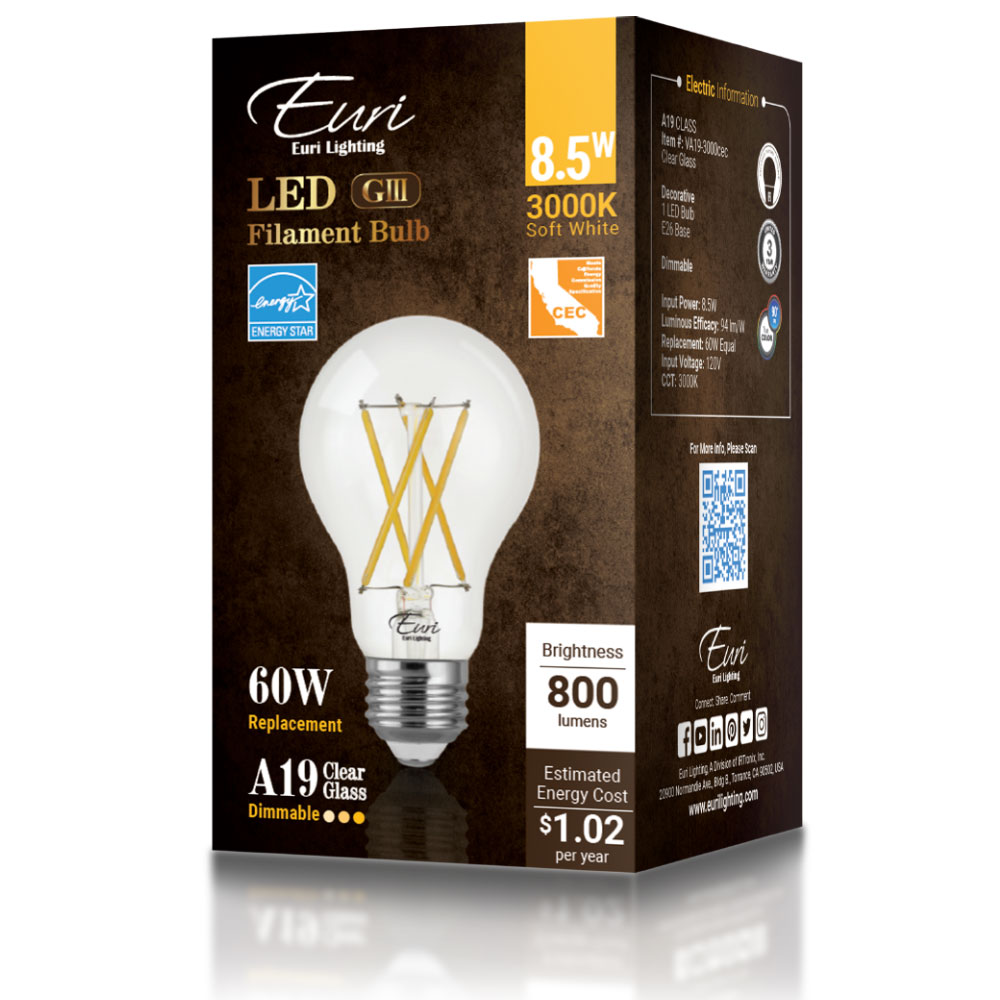 Euri Lighting VA19-3000cec 8.5 Watt A19 Filament LED 3000K 120V