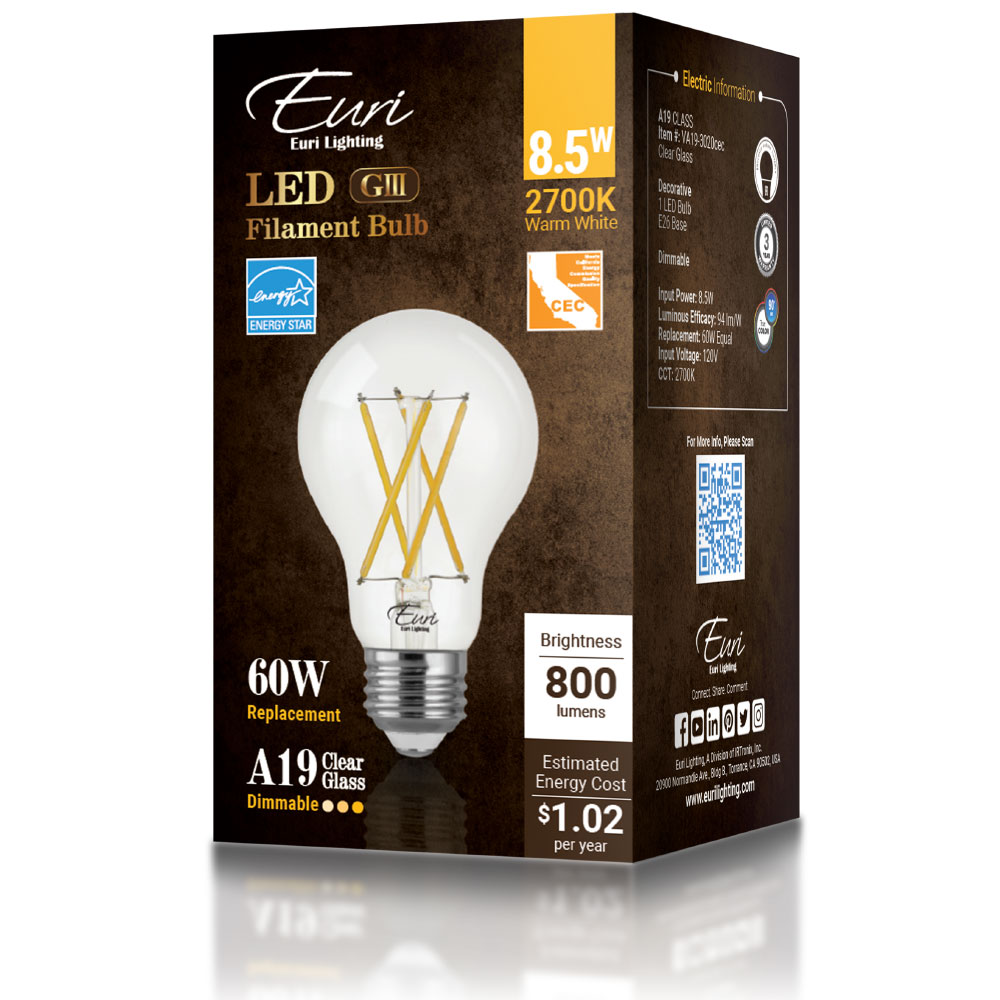Euri Lighting VA19-3020cec 8.5 Watt A19 Filament LED 2700K 120V